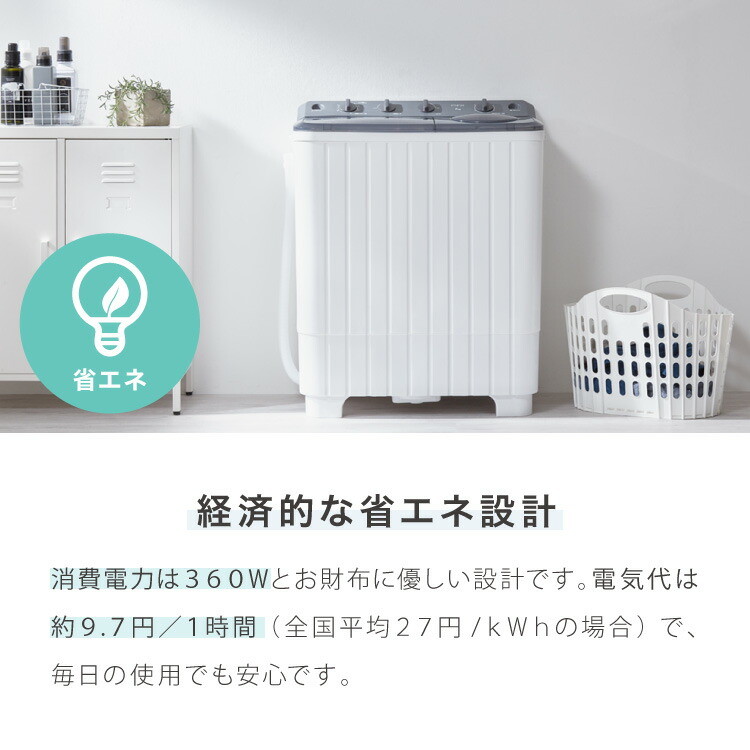 また、省エネ設計で消費電力は360W。電気代は約9.7円/1時間(全国平均27円/kWhの場合)で、毎日の使用でも安心です。手動排水機能により水の再利用が可能で、タンクや水位を自分で調整できる半自動タイプで、無駄なく水を使えます。ダブルモーター式で、洗濯と脱水が独立して運転し、耐久性も優れています。