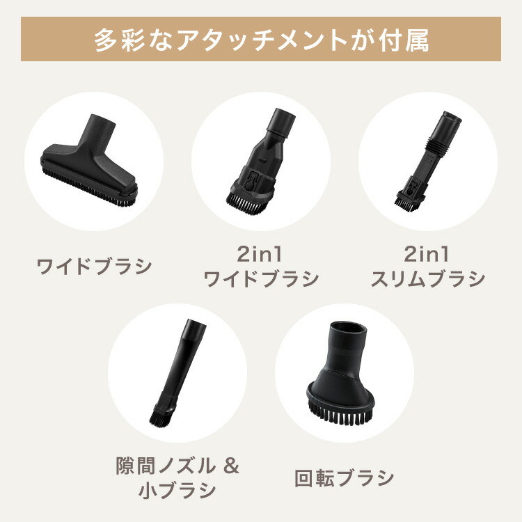 付属品:隙間ノズル&小ブラシ、ワイドブラシ、2in1ワイドブラシ、2in1スリムブラシ、回転ブラシ、USB充電ケーブル、取扱説明書