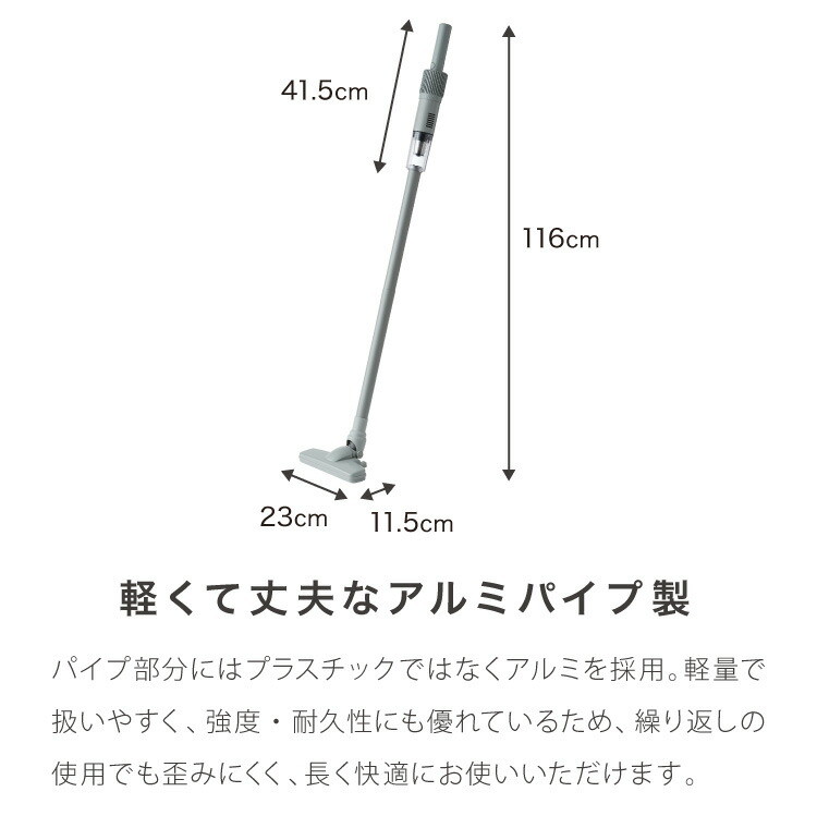 高回転&高耐久のDCモーターを採用し、吸引力と持続性を両立。しっかり掃除したい方にぴったりです。