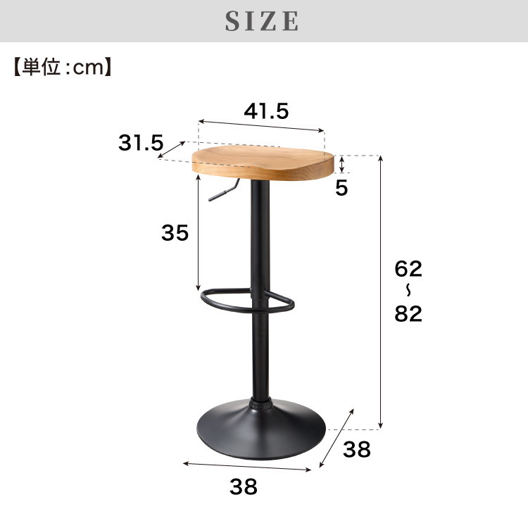 ・ガス圧式の高さ調節で座面を62~82cmの間で無段階に調節が可能。