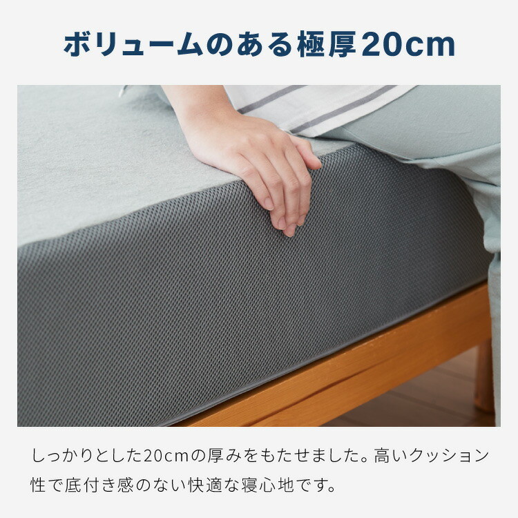 | サイズ/寸法 | セミシングル:幅80×長さ180×厚さ20cm シングル:幅97×長さ195×厚さ20cm セミダブル:幅120×長さ195×厚さ20cm ダブル:幅140×長さ195×厚さ20cm クイーン:幅160×長さ195×厚さ20cm キング:幅180×長さ195×厚さ20cm 許容範囲:±5% |