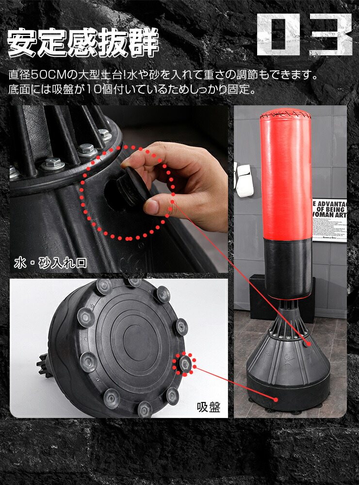 | 原材料/素材/材質 | サンドバッグ:PVCレザー、発泡ポリエチレン、XPE 土台:樹脂 |