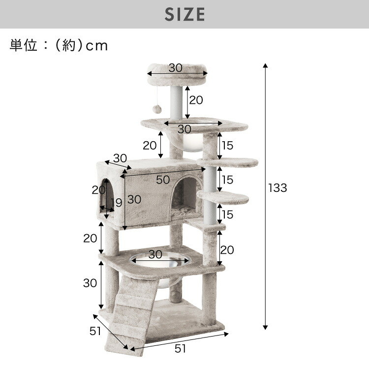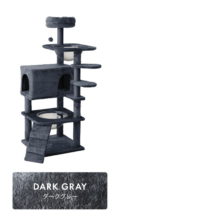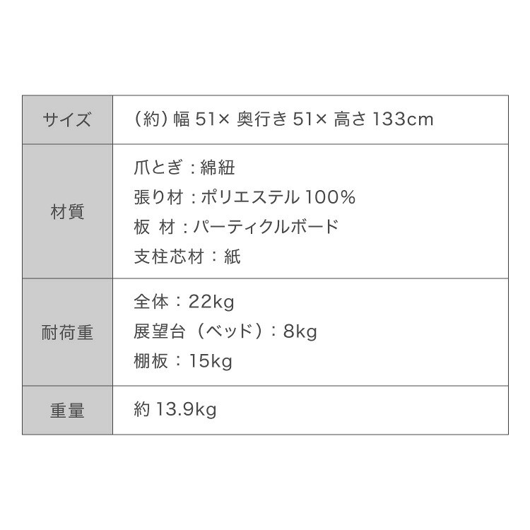 キャットタワー ツリーハウス シニア猫 子猫 短足猫 据え置き スリム 51×51cm 高さ133cm 綿縄 ダークグレー