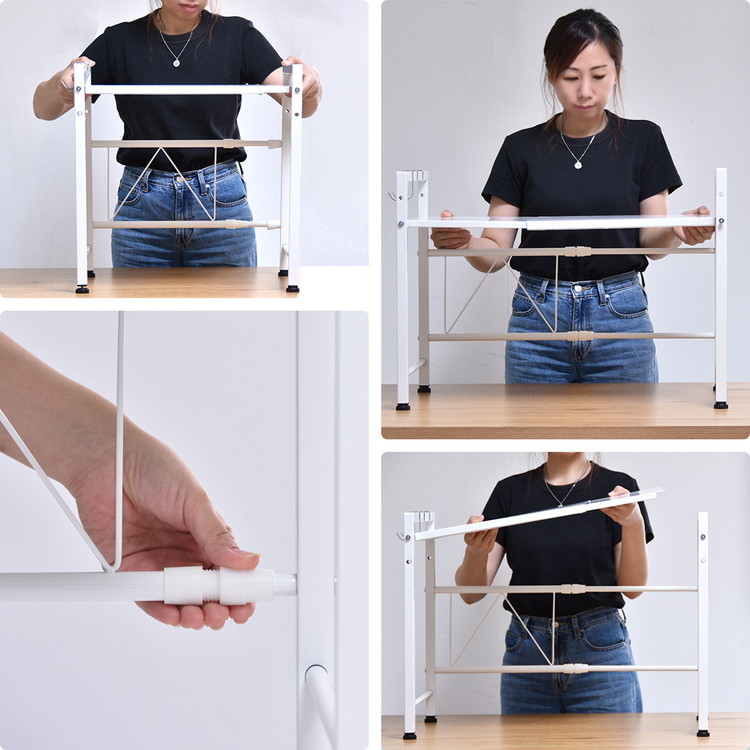 スタイリッシュなホワイトを基調とした収納シリーズMarche(マルシェ)。おうちの中の小物を見栄え良く整理するのに便利なシリーズです。スペースをとりがちなキッチン家電まわりをすっきりと見せてくれるレンジラック。使いやすい伸縮タイプで、キッチンスペースに合わせてご使用いただけます。