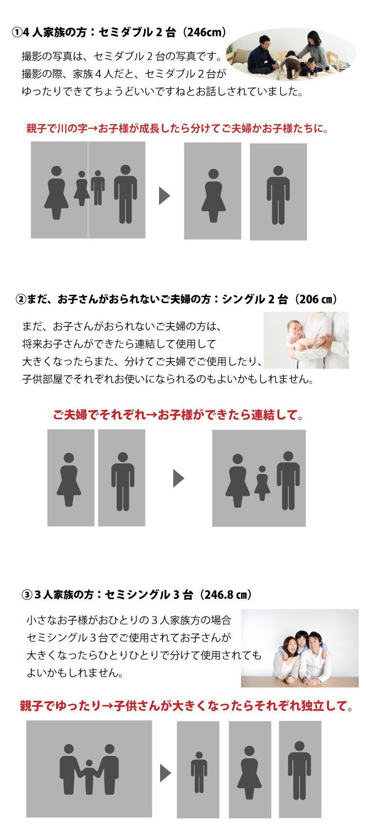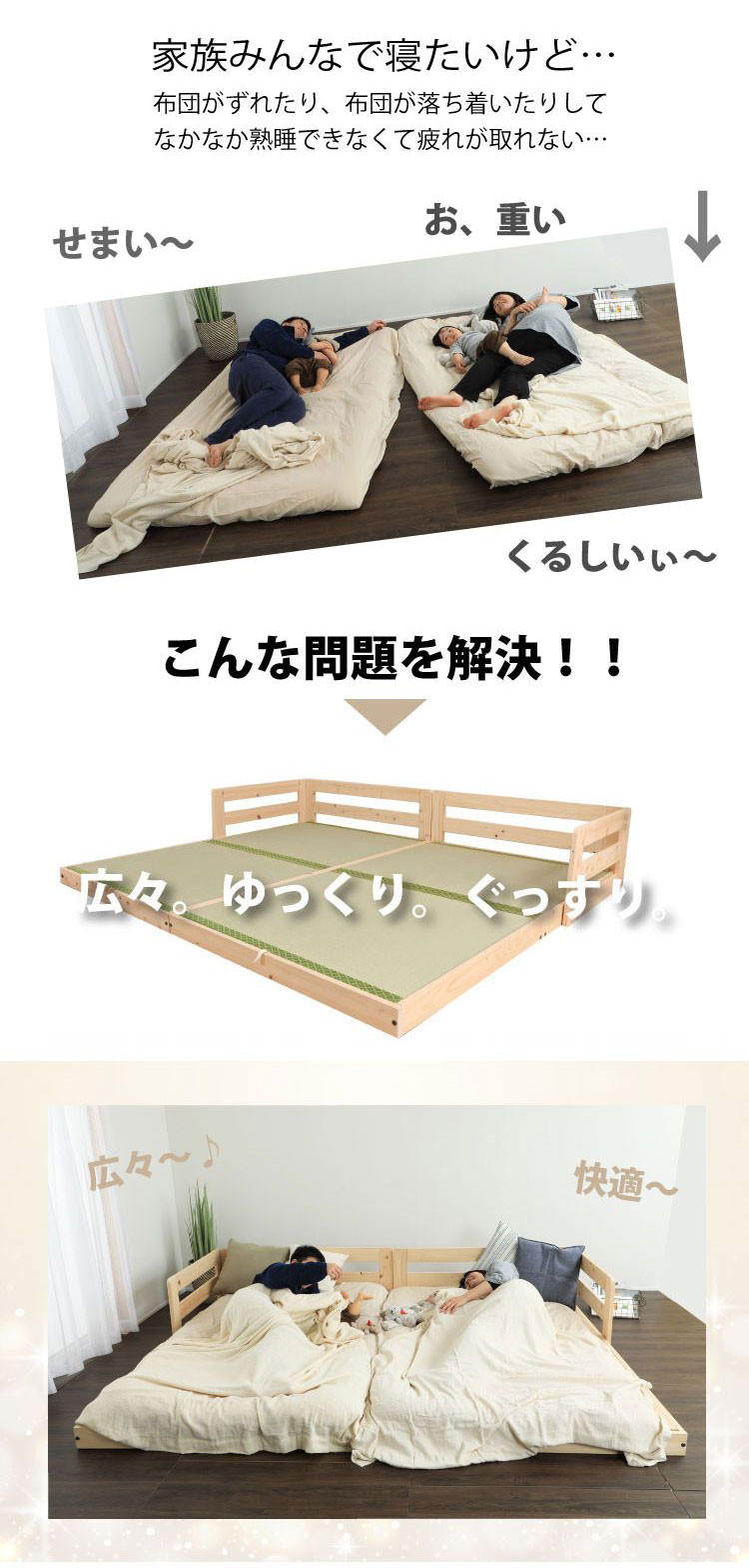 国産のヒノキ材を贅沢に使用したローベッド。金具でピッタリ連結できるので家族で川の字で寝る事ができます。