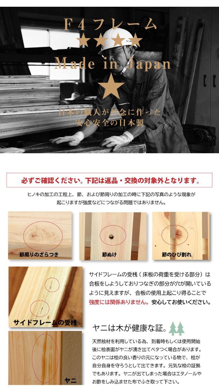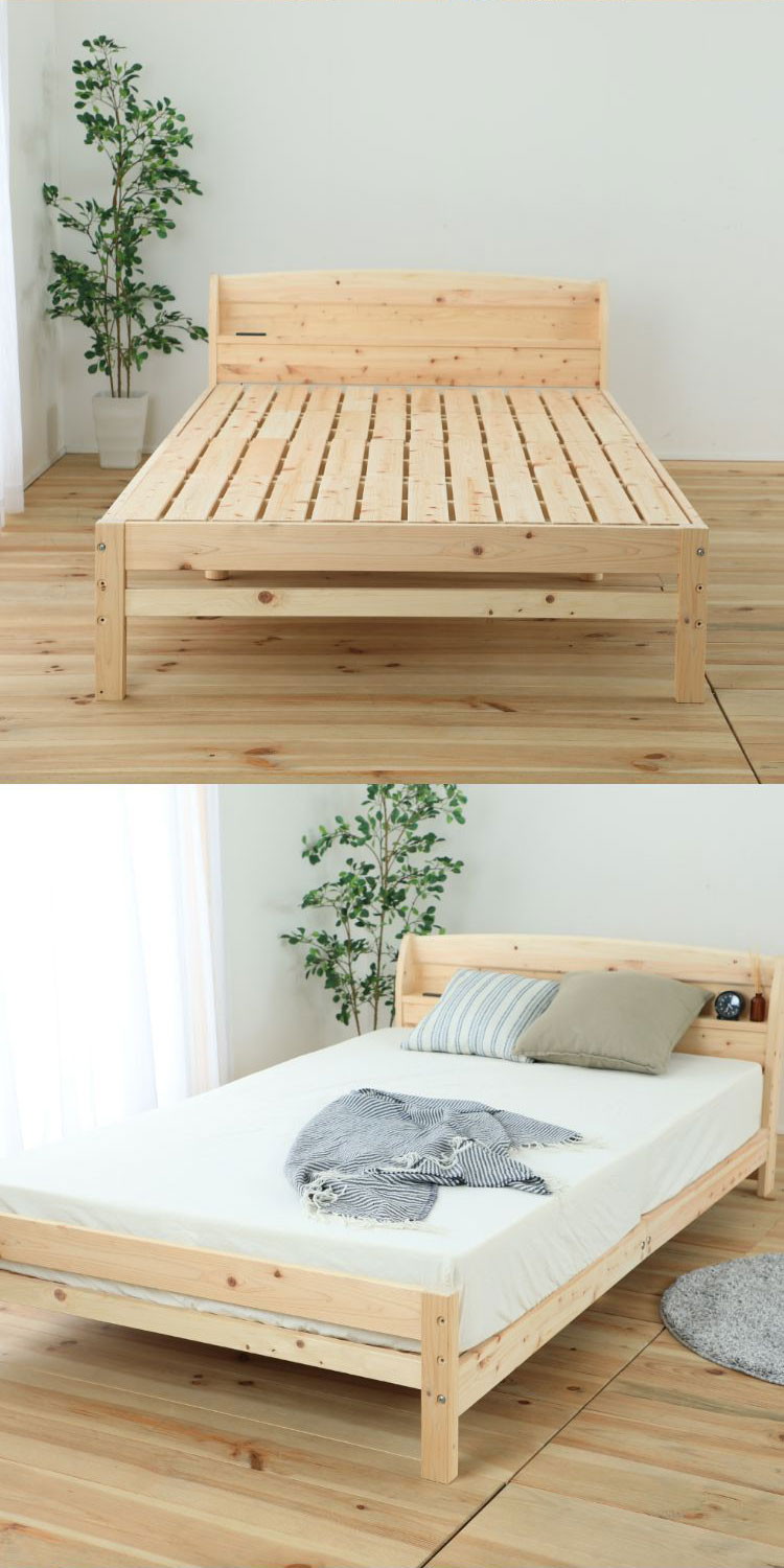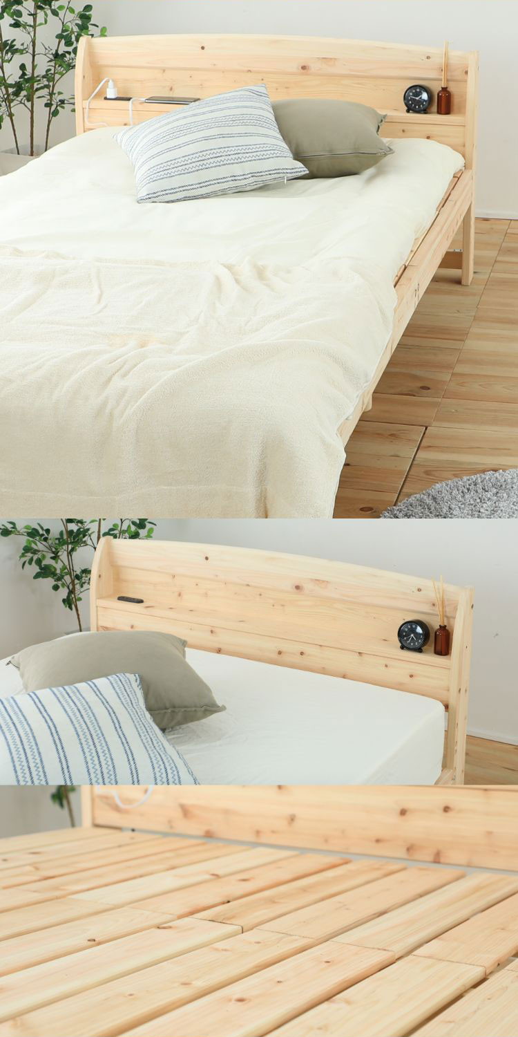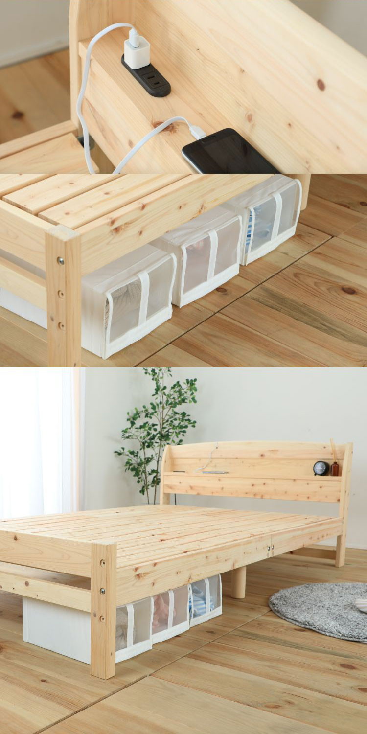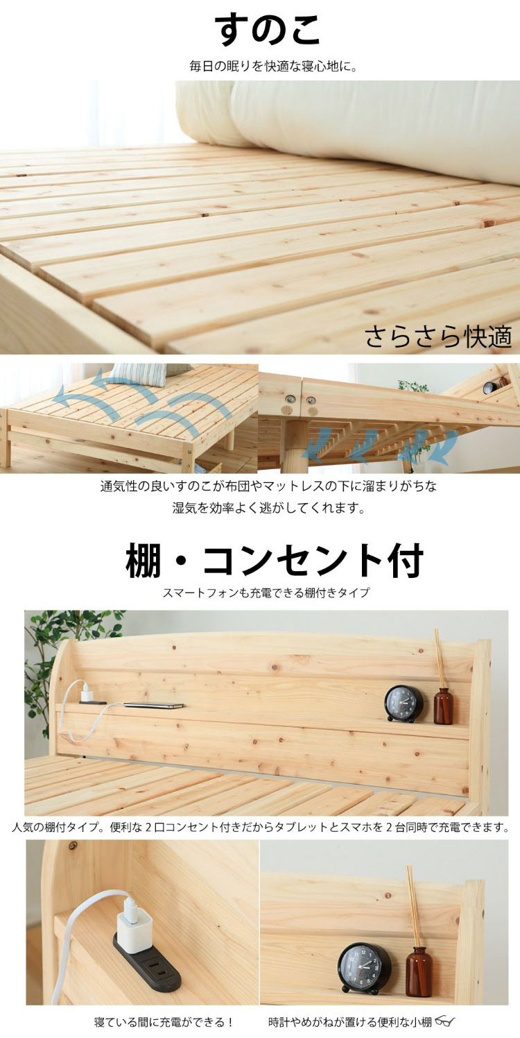 便利な棚コンセント付きのヒノキベッド。佐川急便で配送可能。2口コンセント付き。1500W