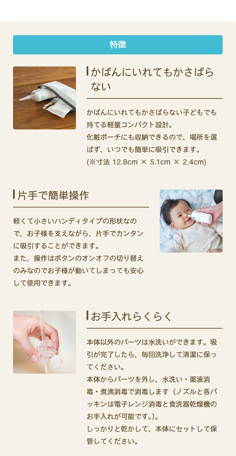 軽くて小さいハンディタイプの形状なので、お子様を支えながら、片手でカンタンに吸引することができます。