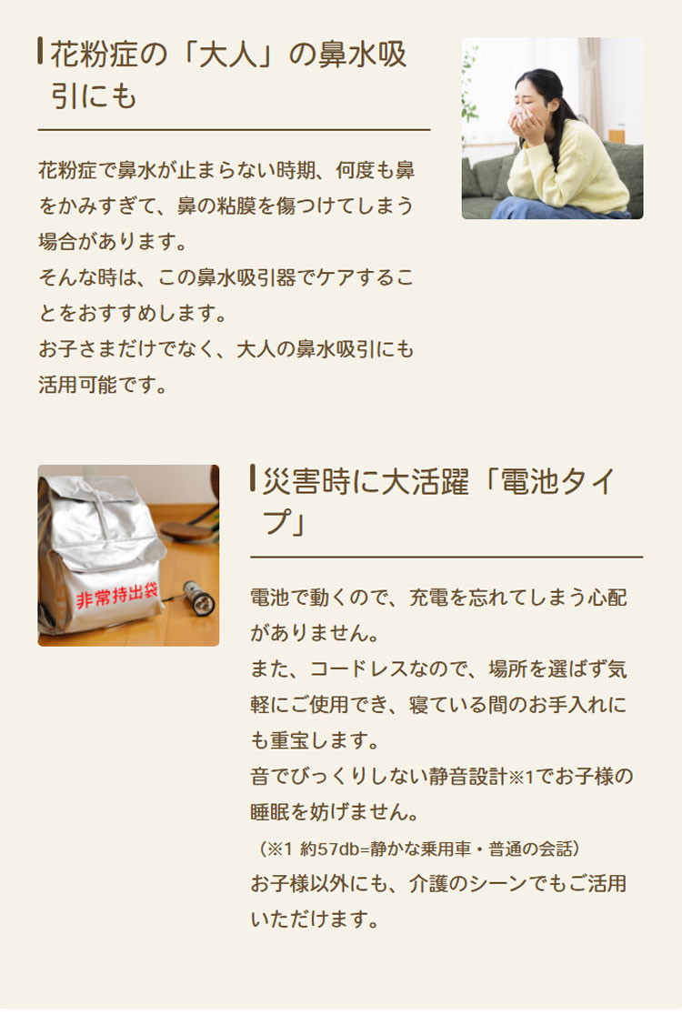 お子さまだけでなく、大人の鼻水吸引にも活用可能です。