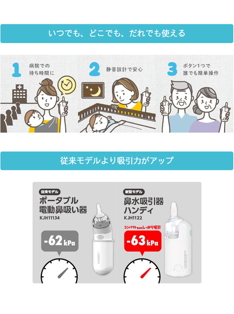 電動鼻水吸引器ハンディ 電池式 簡単操作 防水 防塵 コードレス 管理医療機器 Dr.EDISON KJH1122 KJH110410 ホワイト