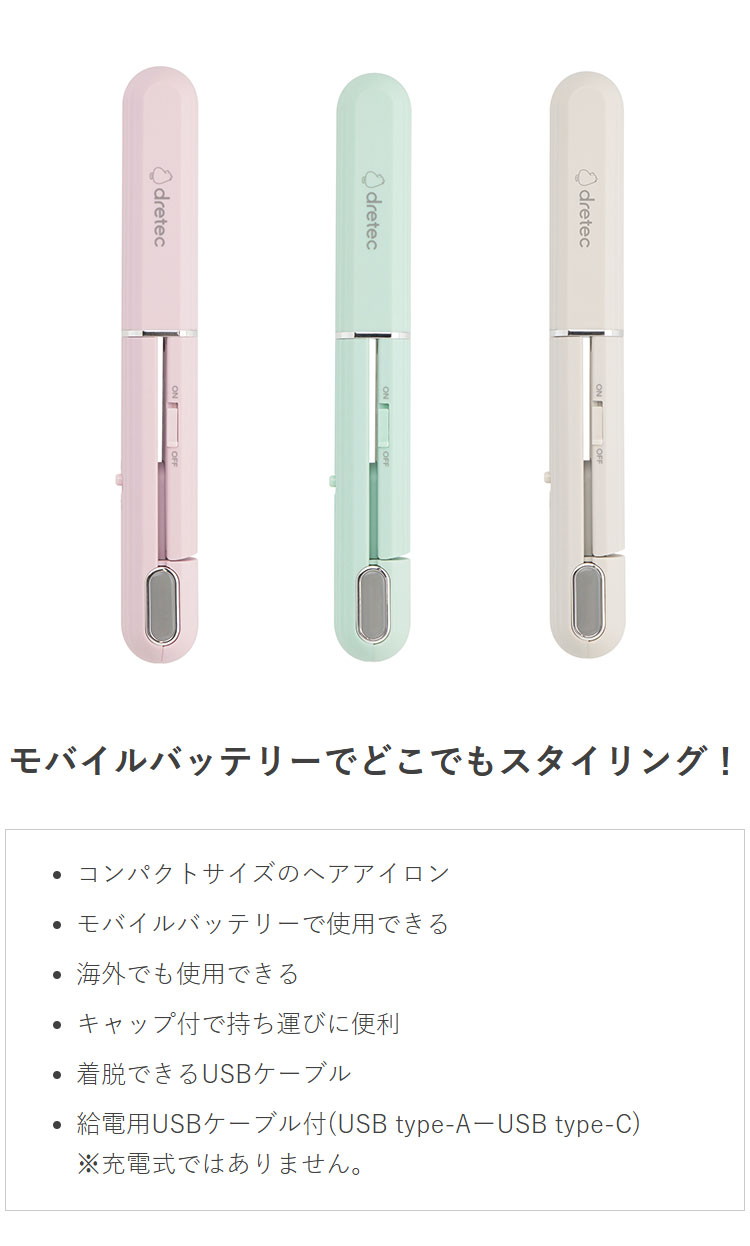 dretec キャップ付きヘアアイロン USB給電式 コンパクト 持ち運び モバイルバッテリー可 2本目 2台目 HI-100 ドリテック ピンク