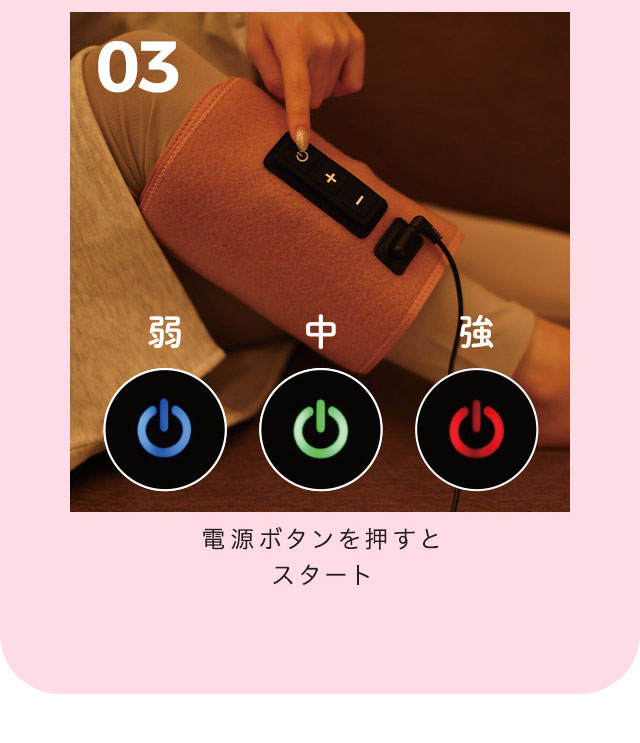 面ファスナーだから足に巻くだけの簡単装着。どなたでも心地よくお使いいただけます。スタートは電源ボタンをポンとワンタッチ、あとはお任せでOK。強弱は[+][-]ボタンで調節可能です。