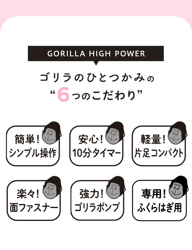 ふくらはぎの疲労とお悩みに、痛きもちイイがやみつきになる強力ポンプ&エアバッグのゴリラのハイパワーシリーズ『ゴリラのひとつかみ』が誕生!はじめてのふくらはぎケアにピッタリの簡単・お手軽タイプです。