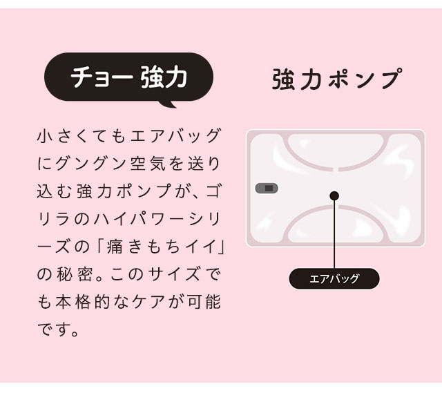 小さくてもエアバッグにグングン空気を送り込む強力ポンプが、ゴリラのハイパワーシリーズの「痛きもちイイ」の秘密。このサイズでも本格的なケアが可能です。