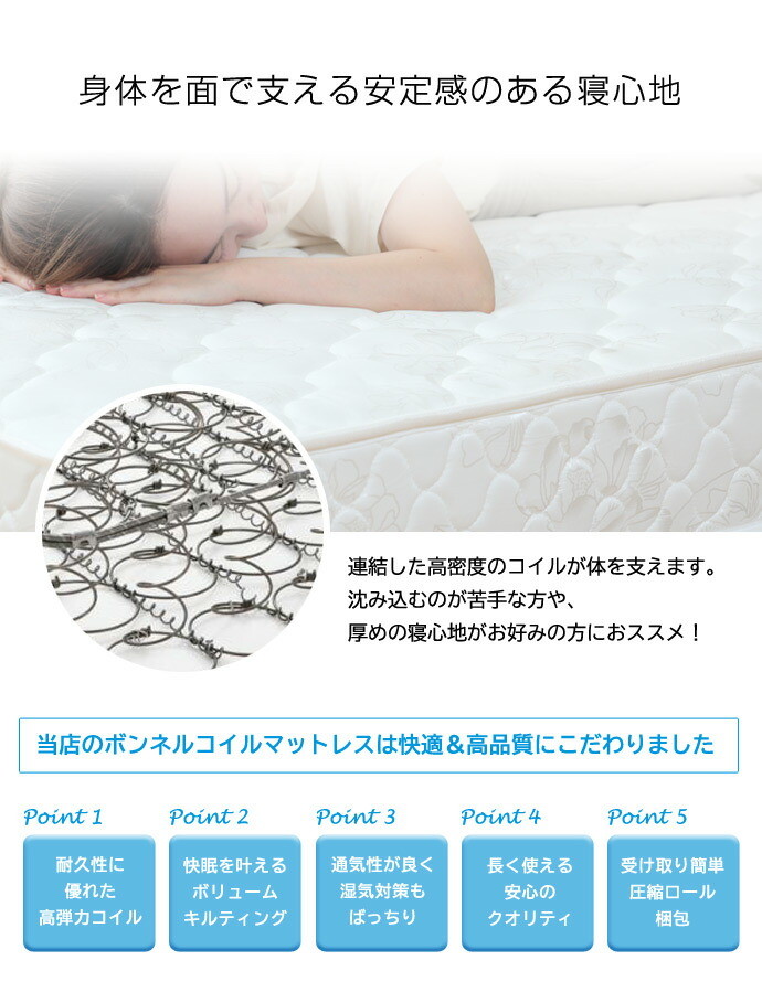 耐久性に優れた高弾力のコイルスプリングを使用し、厚さ約15cmのボリューム感を実現。身体を面で支えるので、安定感があって快適な眠りをサポートします。通気性に優れ、1年中気持ち良くお使いいただけます。お届けの際は、圧縮ロール状態なので、エレベーターや通路、扉の大きさを気にせずに受け取りができます。