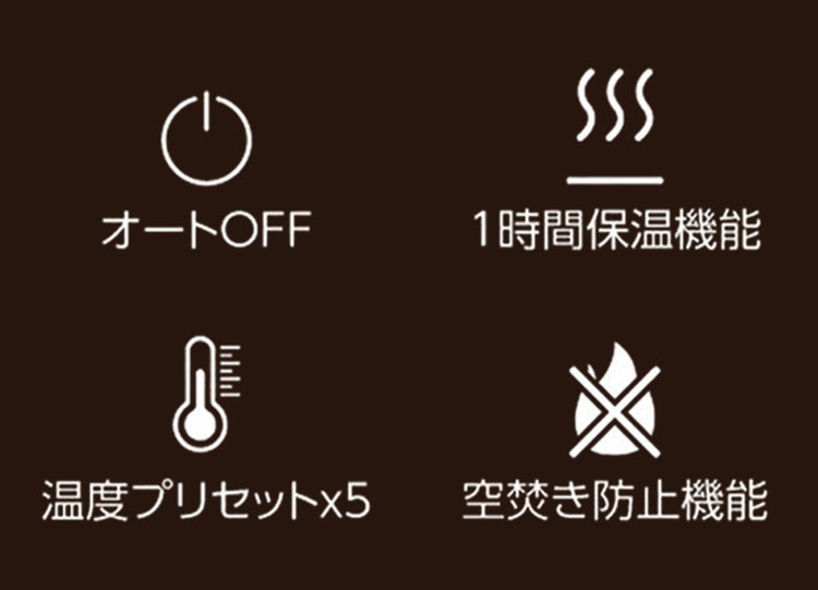 モードと温度:GREEN(緑茶)82℃/OOLONG(鳥龍茶)90℃/COFFEE(コーヒー)96℃/BOILING(沸騰)100℃