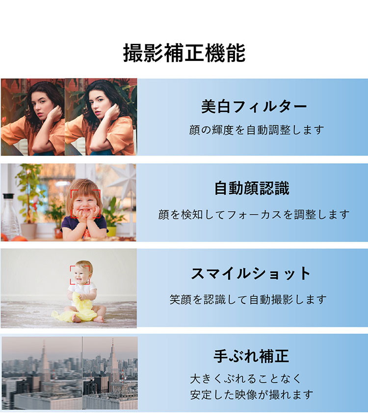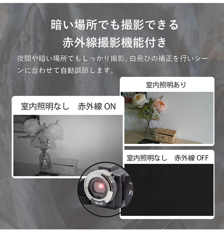 夜間や暗い場所でもしっかり撮影。白飛びの補正を行いシーンに合わせて自動調節します。