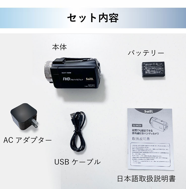 本体、バッテリー、ACアダプター、USBケーブル、取扱説明書