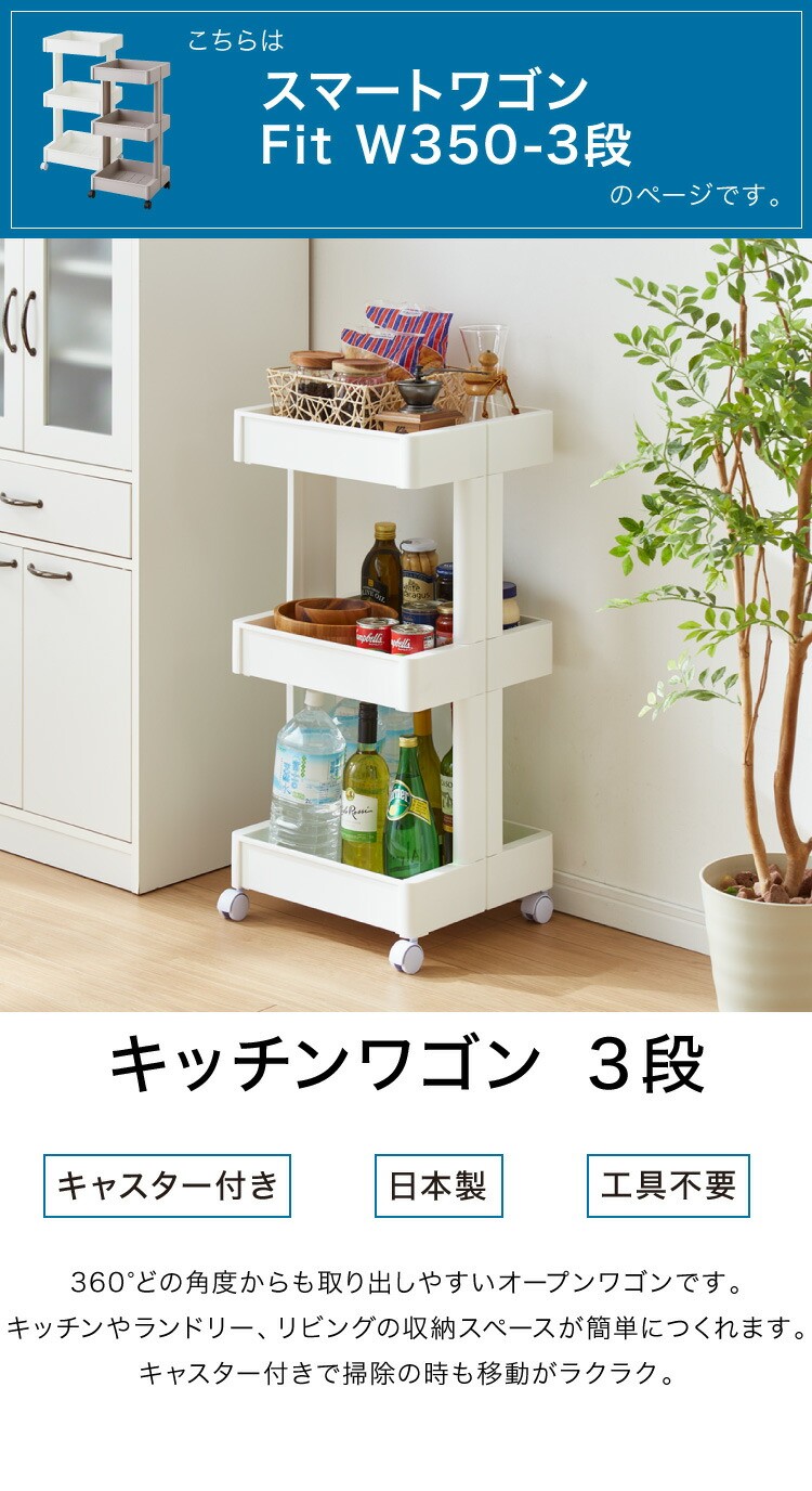 キッチンワゴン キャスター付き 3段 スマート ワゴン Fit W350 2色 組立式 隙間収納 日本製 すき間 収納ストッカー キッチン 食品 ストック 食料ストック 不動技研 グレー
