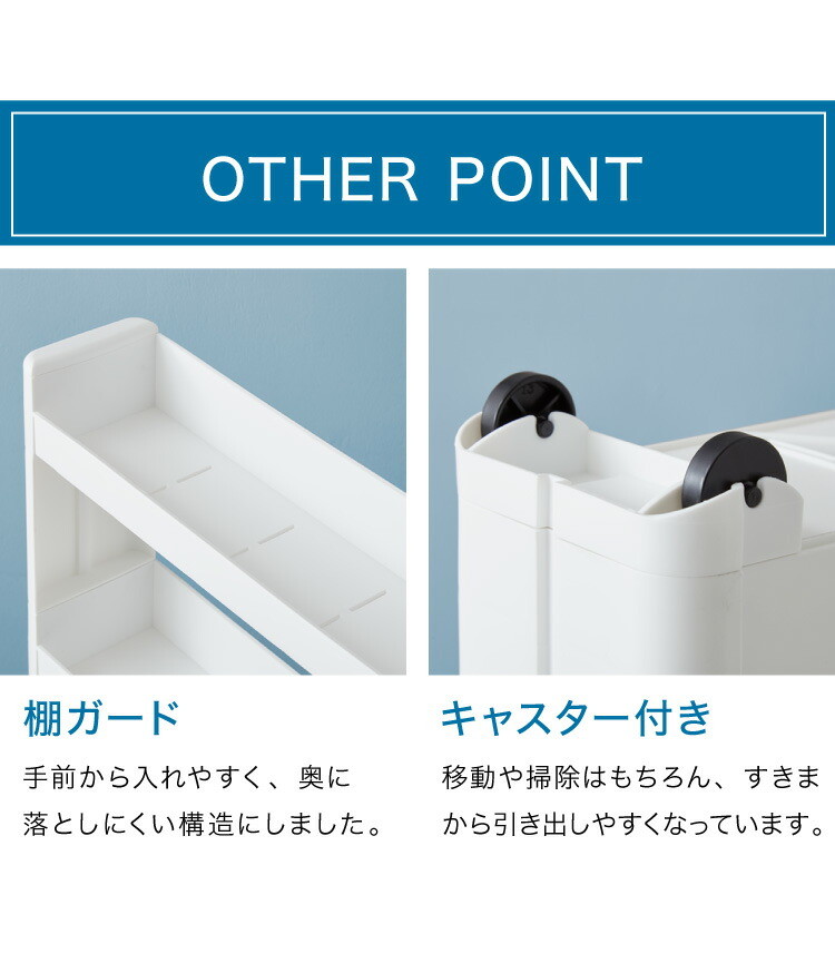 幅わずか12.5cmで冷蔵庫・食器棚・洗濯機横などのすき間に収納ができます。