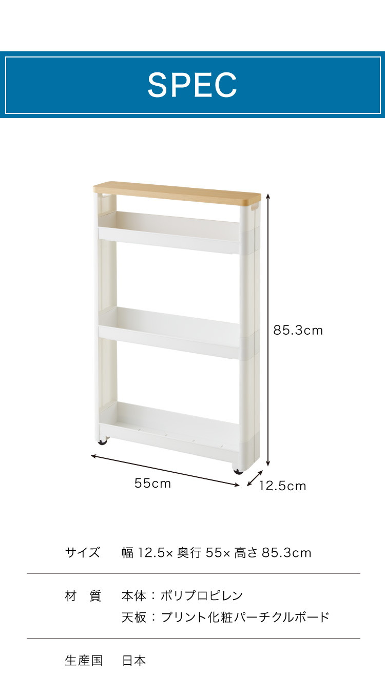 幅わずか12.5cmで冷蔵庫・食器棚・洗濯機横などのすき間に収納ができます。