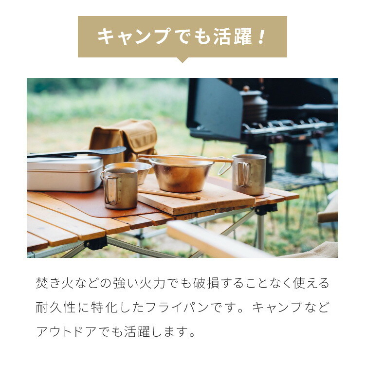 焚き火などの強い火力でも破損することなく使える、耐久性に特化した鉄などで作られたフライパンです。