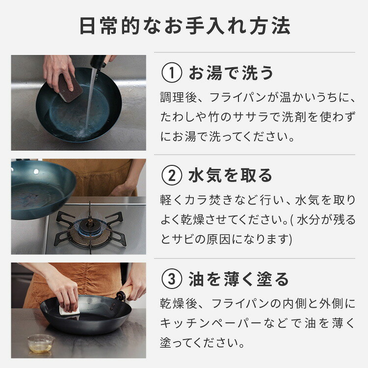 鉄フライパンは正しく使用・きちんとお手入れをすれば、とても長くご使用いただけます。