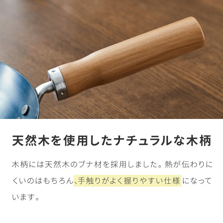 持ち手は天然木を使用:肌触りが良く握りやすい、熱で熱くなりにくい