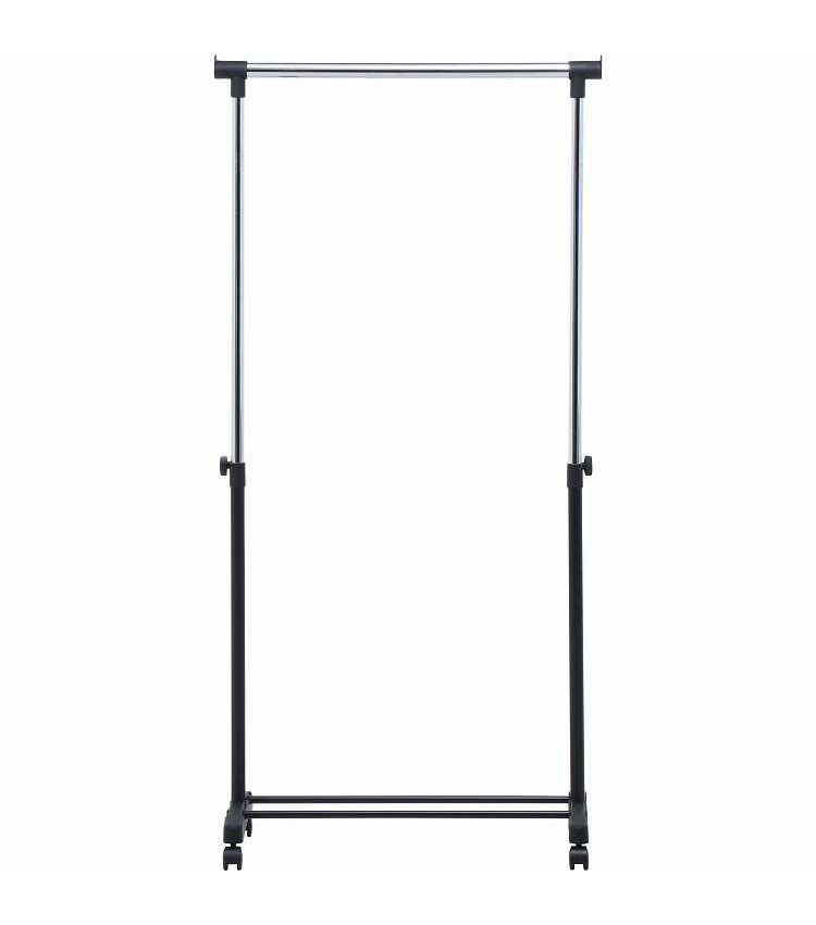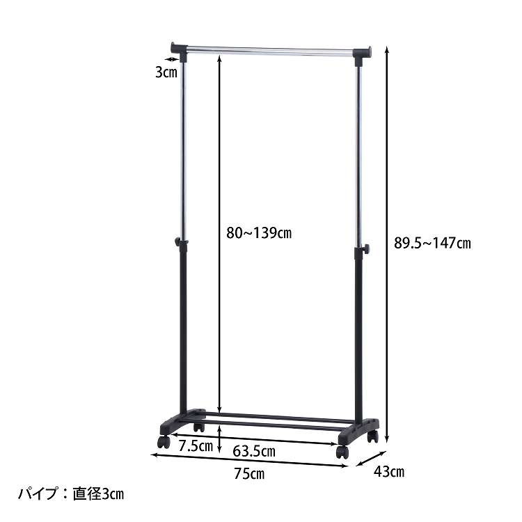 洋服の収納を助けるパイプハンガーラック シングルシンプルなブラックカラーでお部屋の印象もスッキリ。両サイドのツマミを回すと89.5~147cmの高さで自由に調整ができます。耐荷重は15kgで、ワイシャツは最大約15着、ジャケットは最大約12着掛けることができます。(※収納枚数はあくまで目安です)両サイドはフック状になっているので、帽子やバックを掛けることができます。下部の2本のパイプを活用して、収納ボックスなどを置くことができます。キャスターが付いているので、たくさん服をかけてもスムーズに移動できます。