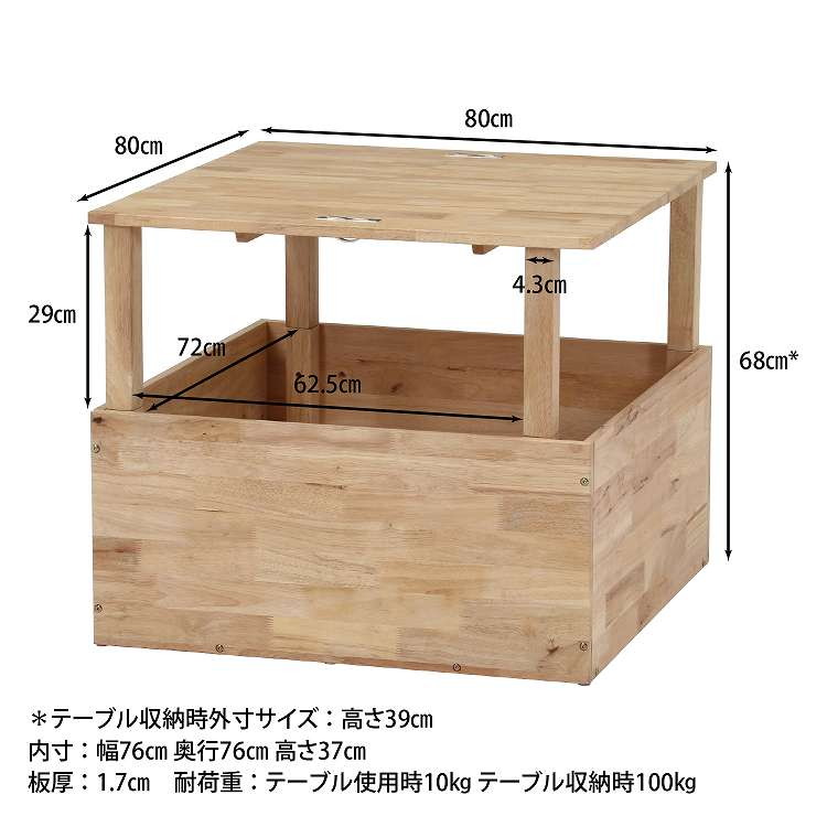 自由に組み合わせて新たな空間を作るTATAMIシリーズ センターテーブル天然木の木目や節といった個性をそのまま活かしたデザインです。幅80×奥行80cmで食事やパソコンを広げての作業も可能です。天板の下は収納スペースになっており、ブランケットなどのかさばるの大きな物も収納できます。天板には回転取っ手が付いています。しっかり力が入るので天板も引き上げやすく、普段の見た目はスッキリ。天板を閉めたときの耐荷重は100kgなので、大人の男性も気にせずゆったり座れます。別売りのTATAMIシリーズと合わせてスキップフロアや掘りごたつなどを作ることができます。