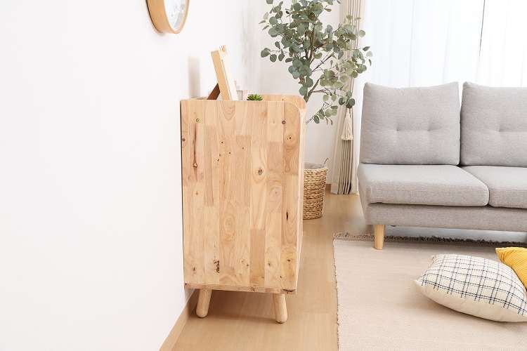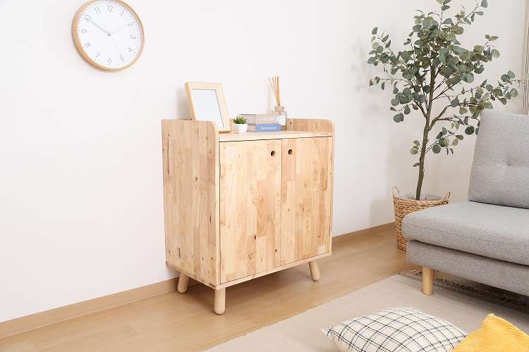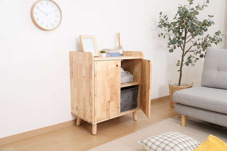 天然木の温かみが広がる壁面収納ユニットシリーズ 扉付きボトムキャビネット天然木の木目や節といった個性をそのまま活かしたデザインです。横板は丸みを帯びており、優しい印象を与えます。見た目もスッキリな扉収納なので、書類や見せたくないものをドサッと収納できます。棚板ピッチは90mmで高さを3段階で調節できる可動式。収納したい物に合わせて高さを決めることができます。高さ80cmと子どもでも使いやすく、お部屋に置いても圧迫感を感じにくい大きさです。棚下13.5cmあるので、柄の長い掃除用品やロボット掃除機も通れます。ホコリが溜まりやすい部分をキレイに保つことができます。別売りのトップラックと合わせて収納を拡張できます。