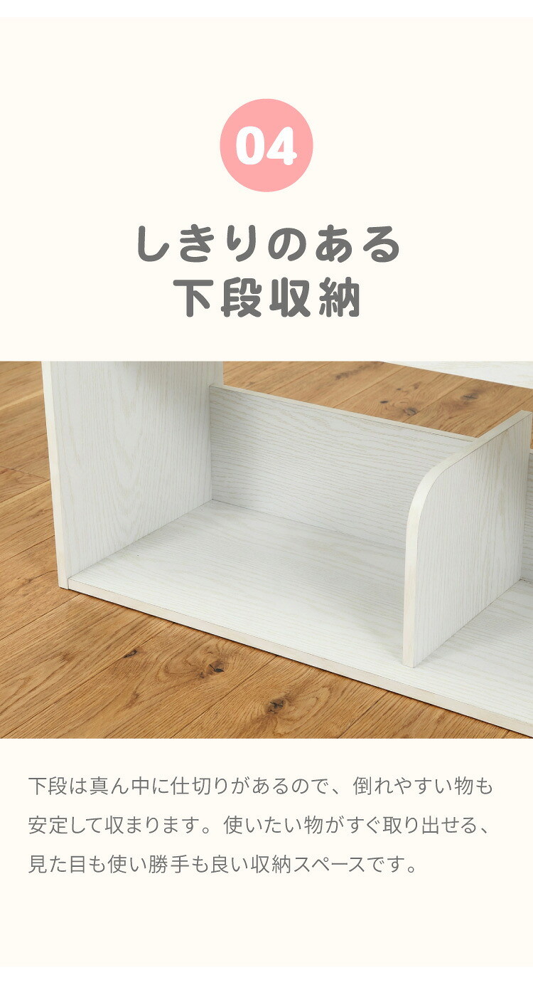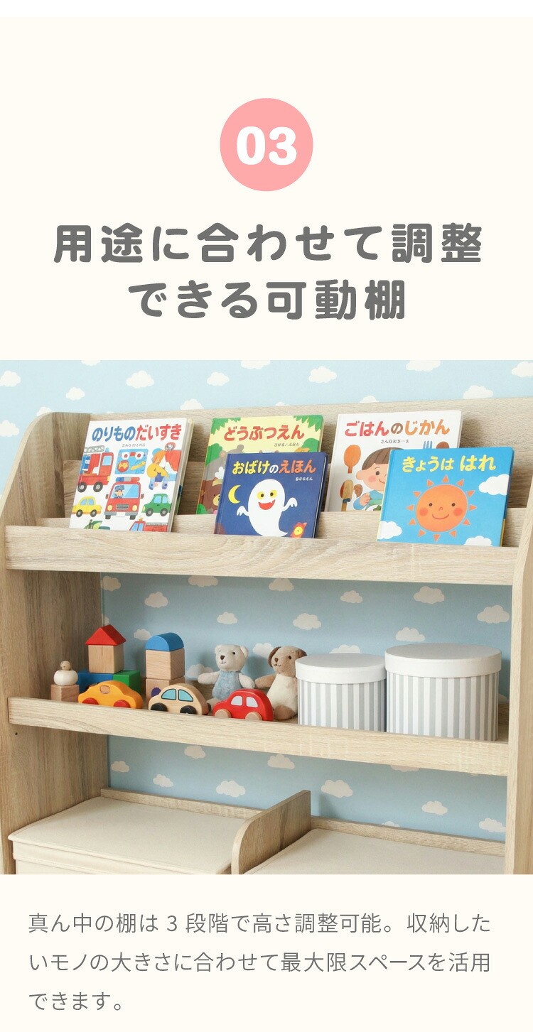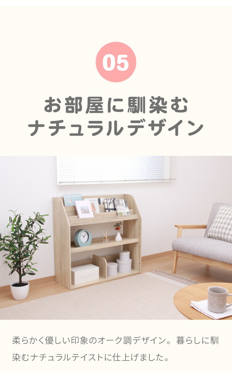 置くだけでおしゃれな空間になるブックラックナチュラルな木目が美しく、優しくお部屋に馴染みます。上段には絵本や雑誌などをディスプレイしながら収納できます。中棚は可動棚になっているので、収納するものに合わせて高さ調節ができます。下段にはバッグやおもちゃなどを収納!出し入れしやすく、使い勝手もバツグンです。高さ80cmのロータイプで、大人も子供も無理なく使えるサイズです。お子様も安心して使えるように、本棚正面の角は丸くデザインしています。
