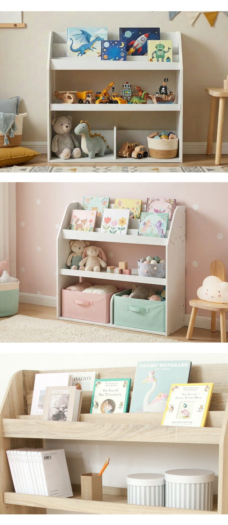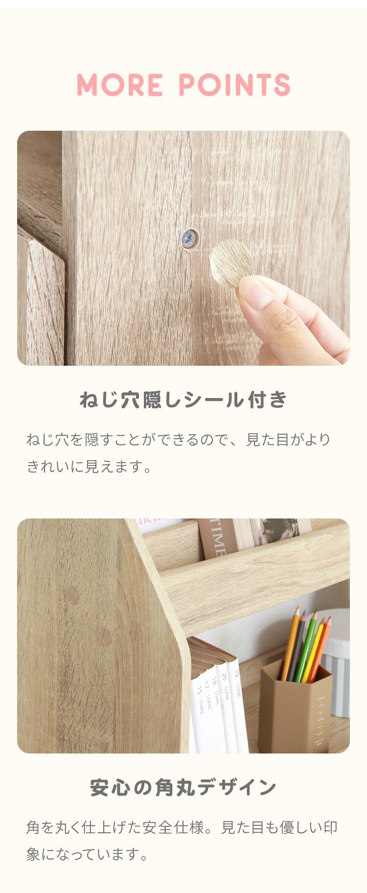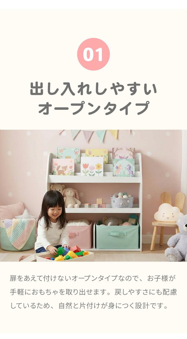 置くだけでおしゃれな空間になるブックラックナチュラルな木目が美しく、優しくお部屋に馴染みます。上段には絵本や雑誌などをディスプレイしながら収納できます。中棚は可動棚になっているので、収納するものに合わせて高さ調節ができます。下段にはバッグやおもちゃなどを収納!出し入れしやすく、使い勝手もバツグンです。高さ80cmのロータイプで、大人も子供も無理なく使えるサイズです。お子様も安心して使えるように、本棚正面の角は丸くデザインしています。