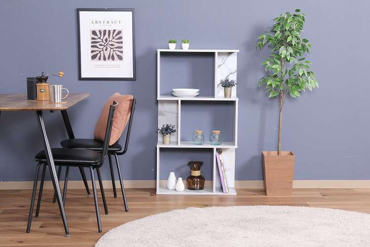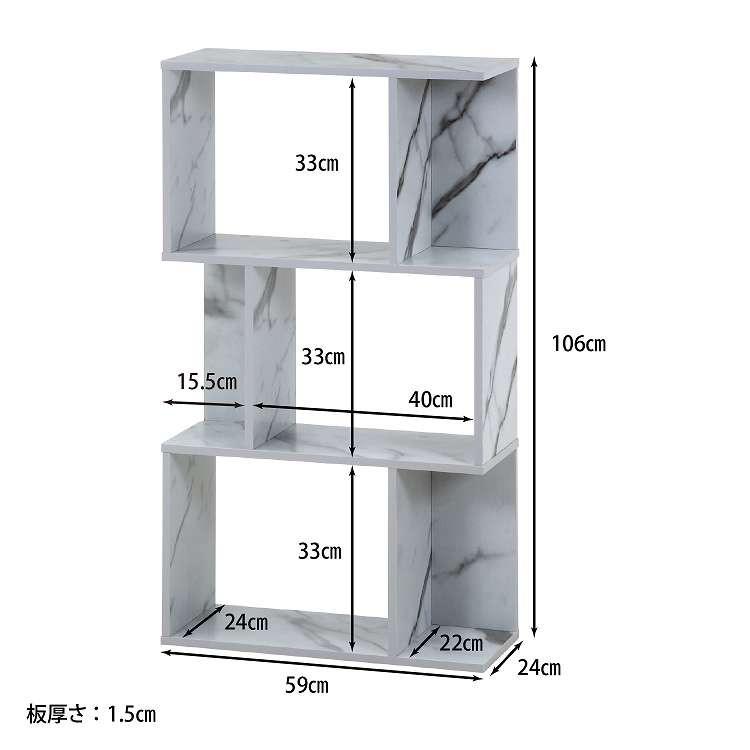 海外風インテリアに!大理石柄S型ディスプレイラック 3段見せる収納にピッタリなオープンラック。デザイン性と収納力を兼ね備えたアイテムです。ショップのディスプレイのような、置くだけで目を惹くデザイン。ディスプレイを楽しみながら収納できます。A4もすっぽり収まる高さ33cmで、ファイルや雑誌の収納にもぴったりです横置きでも使用できるので、収納したいものや空間に合わせて自由に設置できます。背面まで大理石柄なので、間仕切りとしても使用できます。オープンデザインでお部屋に圧迫感を出しません。リビング以外にもキッチン収納としてなど、幅広い場面で使用できます。