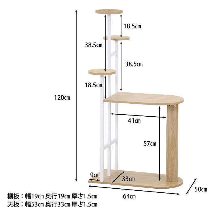 プランタースタンドにも!マルチに使えるディスプレイサイドテーブルお花や小型の観葉植物をよりおしゃれに楽しむことができるディスプレイラックです。植物と相性のいいスチール×木目のデザインで、インテリアによく馴染みます。奥行33cmのスリムサイズなので、コーナーなどの狭いスペースも有効活用できます。たっぷり物が置ける天板スペースでティータイムやデスクワークも快適です。グリーンだけでなく、写真立てやお気に入りの雑貨を飾るなど使い方は様々。裏表がないデザインなので、お部屋の間仕切りに使用することもできます。天板には傷や汚れに強いと云われているメラミンシートを使用。汚れてもサッと拭くだけでお手入れ簡単です。