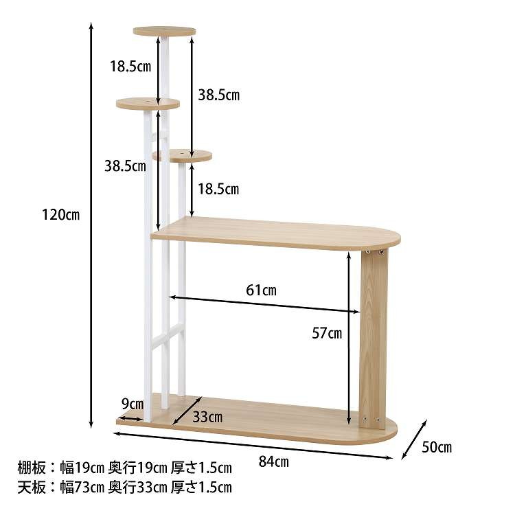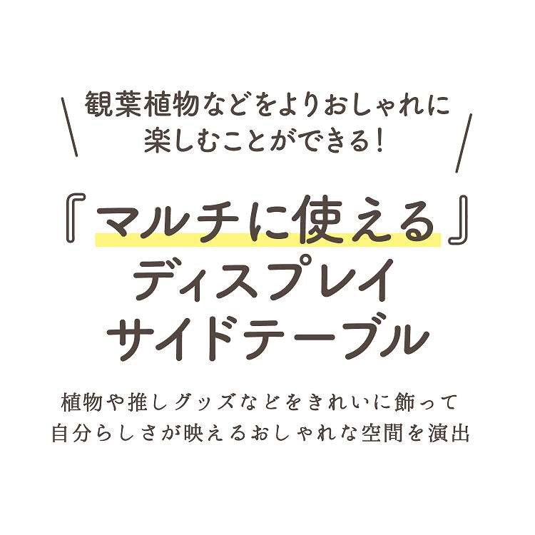 プランタースタンドにも!マルチに使えるディスプレイサイドテーブルお花や小型の観葉植物をよりおしゃれに楽しむことができるディスプレイラックです。植物と相性のいいスチール×木目のデザインで、インテリアによく馴染みます。奥行33cmのスリムサイズなので、コーナーなどの狭いスペースも有効活用できます。たっぷり物が置ける天板スペースでティータイムやデスクワークも快適です。グリーンだけでなく、写真立てやお気に入りの雑貨を飾るなど使い方は様々。裏表がないデザインなので、お部屋の間仕切りに使用することもできます。天板には傷や汚れに強いと云われているメラミンシートを使用。汚れてもサッと拭くだけでお手入れ簡単です。