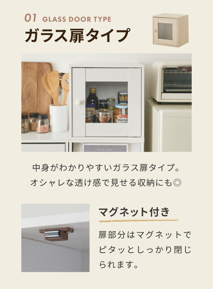 タイプ:ガラス扉タイプ / フラップ扉タイプ / 引き出しタイプ / オープンタイプ / ファイル収納 / ぴったり扉タイプ