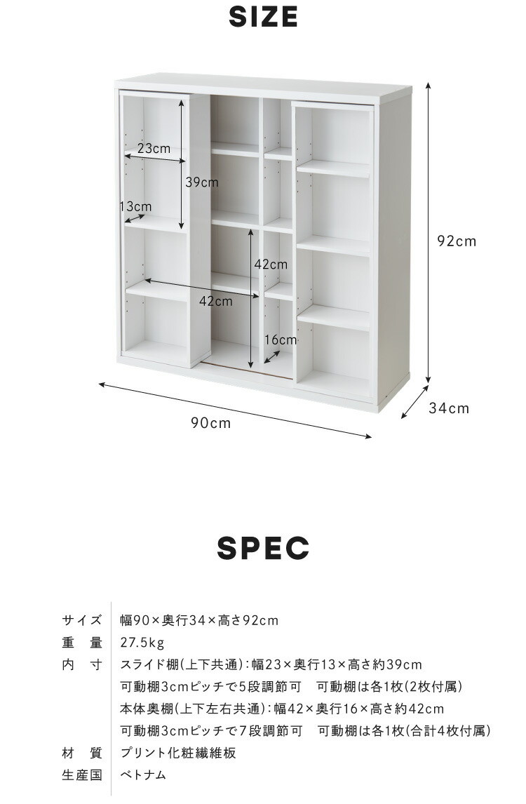 スライド棚、奥棚にはそれぞれ可動棚板があり、上下に微調整して本の高さに合わせることができます。