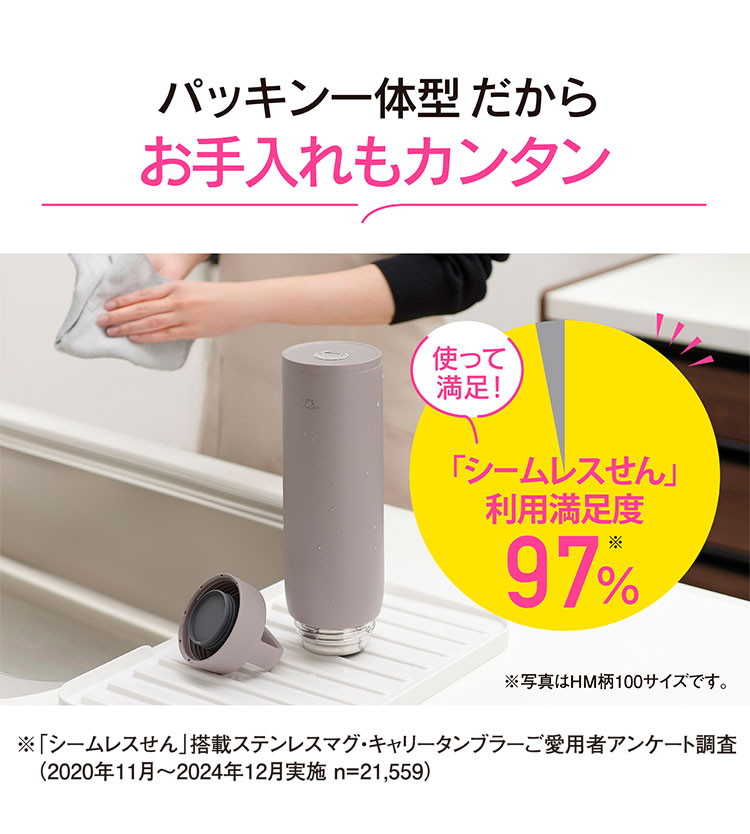 せんとパッキンがひとつになった「シームレスせん」なら、洗うパーツは本体とふたの2点だけ。パッキンのつけ忘れによる水漏れや、なくす心配もありません。