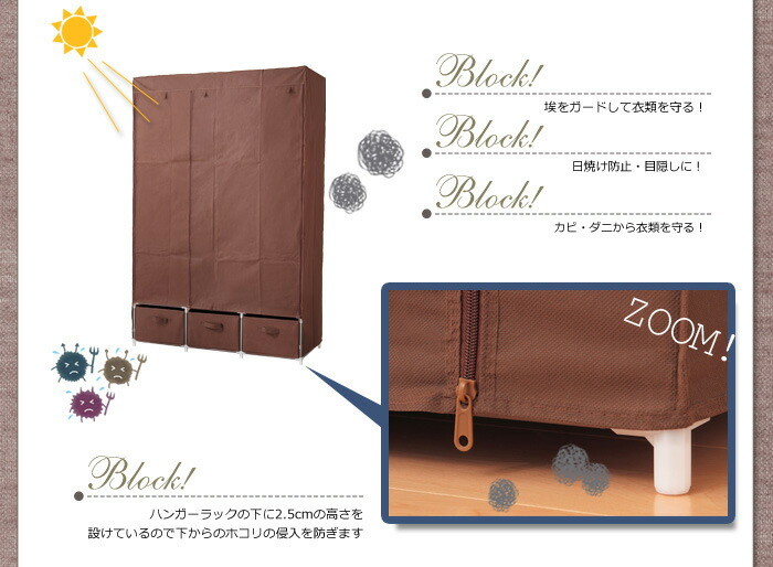 ●カバー付きで大切な衣類をホコリや花粉などからガードしてくれます。また衣類の日焼け防止・目隠しの役割も果たしてくれます。