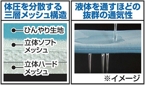 ●弾力性と通気性に優れた立体メッシュ中芯の3層構造が体圧を分散し、腰や肩の負担を軽減します。表地は接触冷感生地で暑い夏でもひんやり快適。