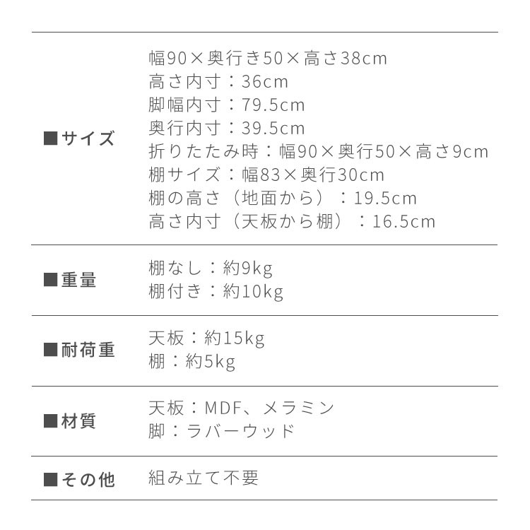折りたたみセンターテーブル 90×50 棚なし/棚付き
