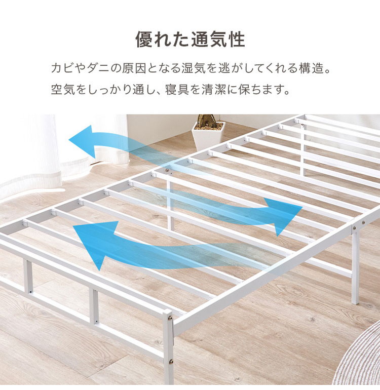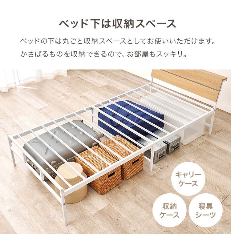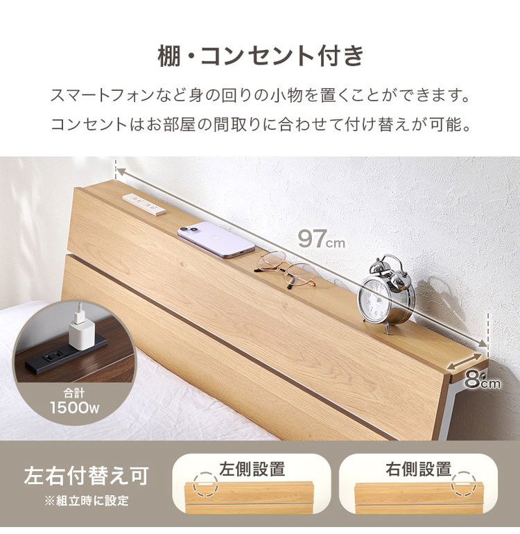 スチールフレームでスッキリとした印象のシングルベッド。ヘッドボードは木目調の傾斜があるパネル仕様です。便利な2口コンセント付き
