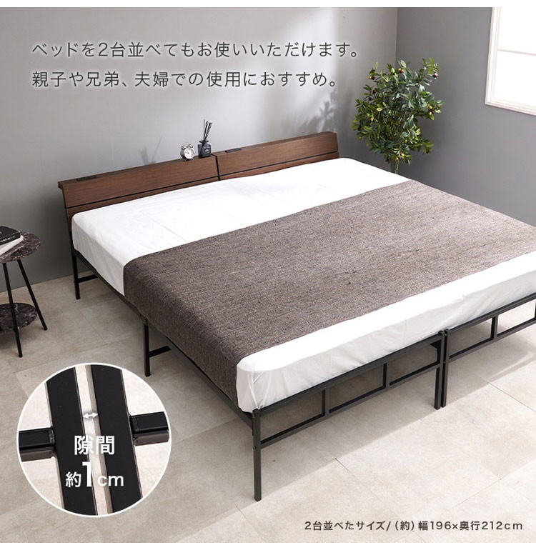 耐荷重300kg 頑丈スチールベッド シングル ポケットコイルマットレス付き 棚コンセント付き ヘッドボード付き ダークブラウン