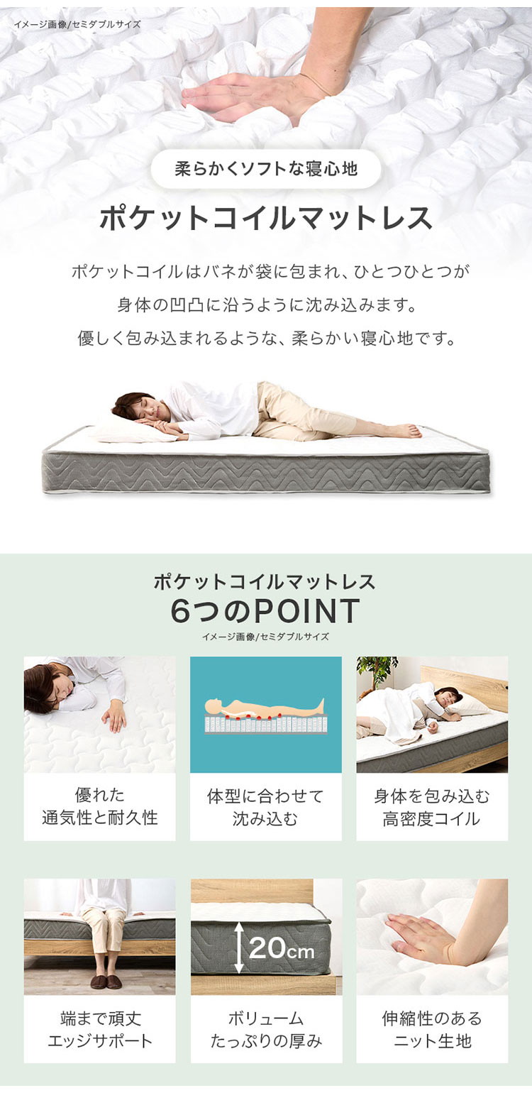 スチールフレームでスッキリとした印象のセミダブルベッド。ヘッドボードは木目調の傾斜があるパネル仕様です。体型に沿うように点で支え、体圧を分散するポケットコイルマットレスセット