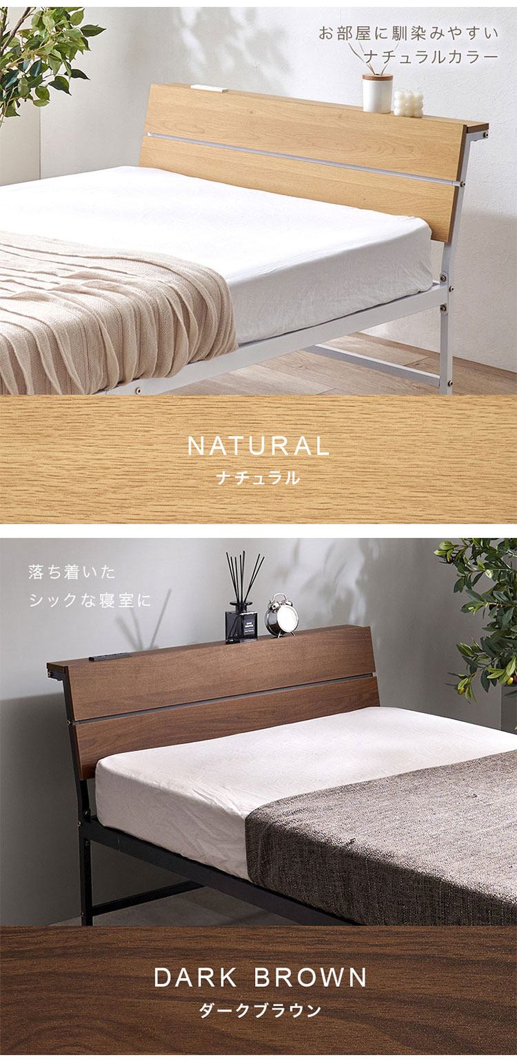 耐荷重300kg 頑丈スチールベッド セミダブル ポケットコイルマットレス付き 棚コンセント付き ヘッドボード付き ダークブラウン