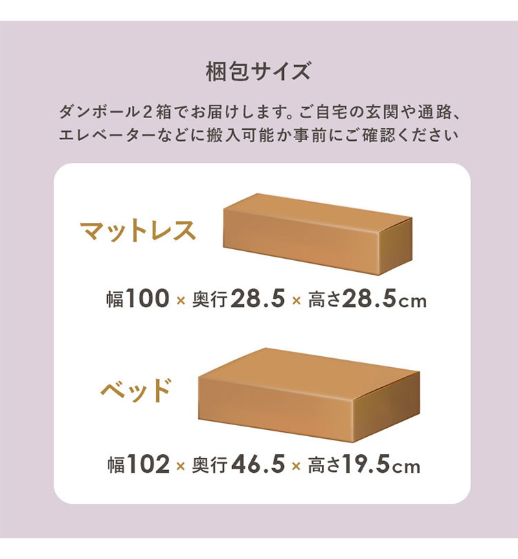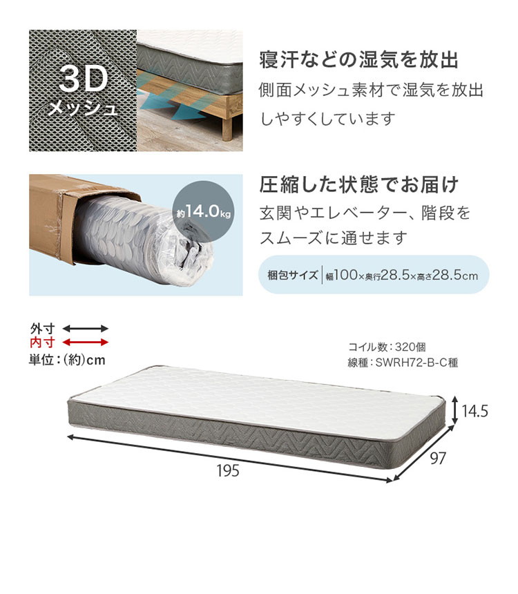 ベッド:(約)幅100×奥行206×高さ74×床面高31/20cm、マットレス:(約)幅97×奥行195×高さ14.5cm
