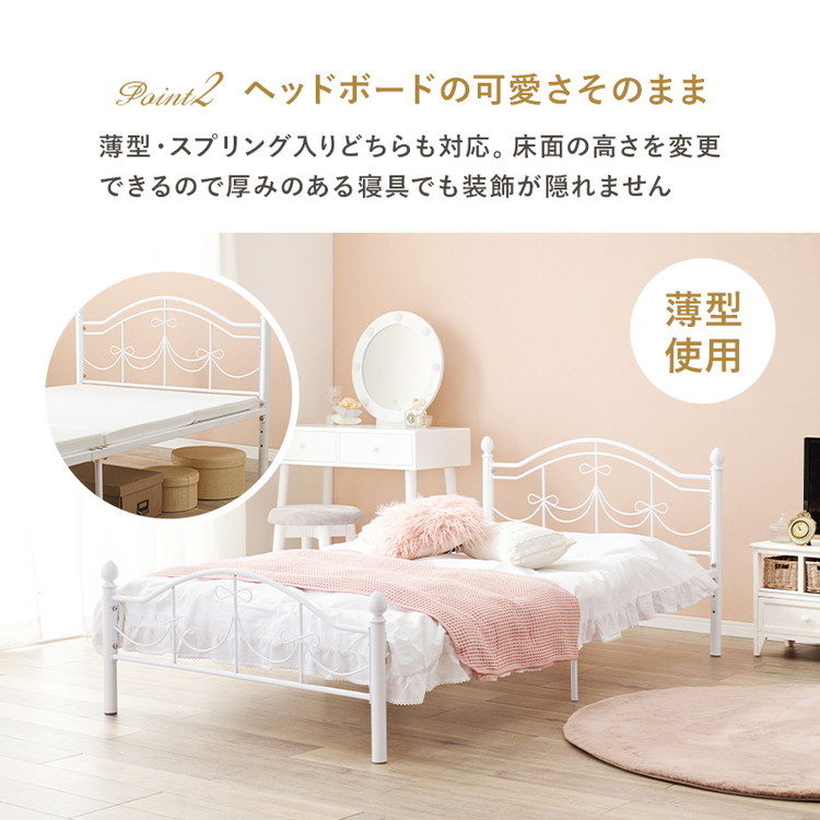 シンプルですっきりしたフォルムにリボンの装飾をあしらった可愛いベッドフレーム。