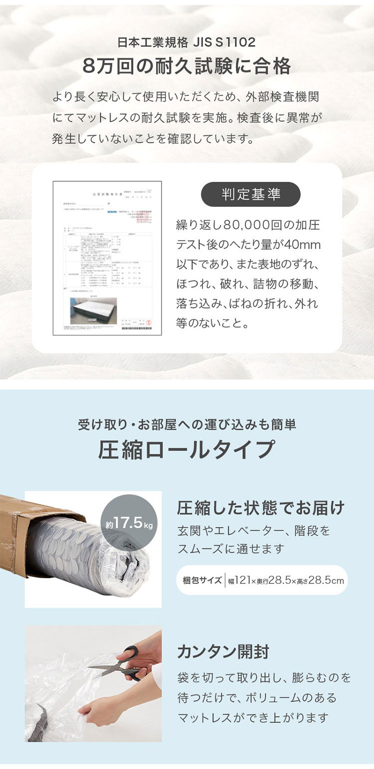 身体全体を面で支え、安定感のある寝心地のボンネルコイルマットレス。圧縮ロールタイプ。セミダブルサイズ