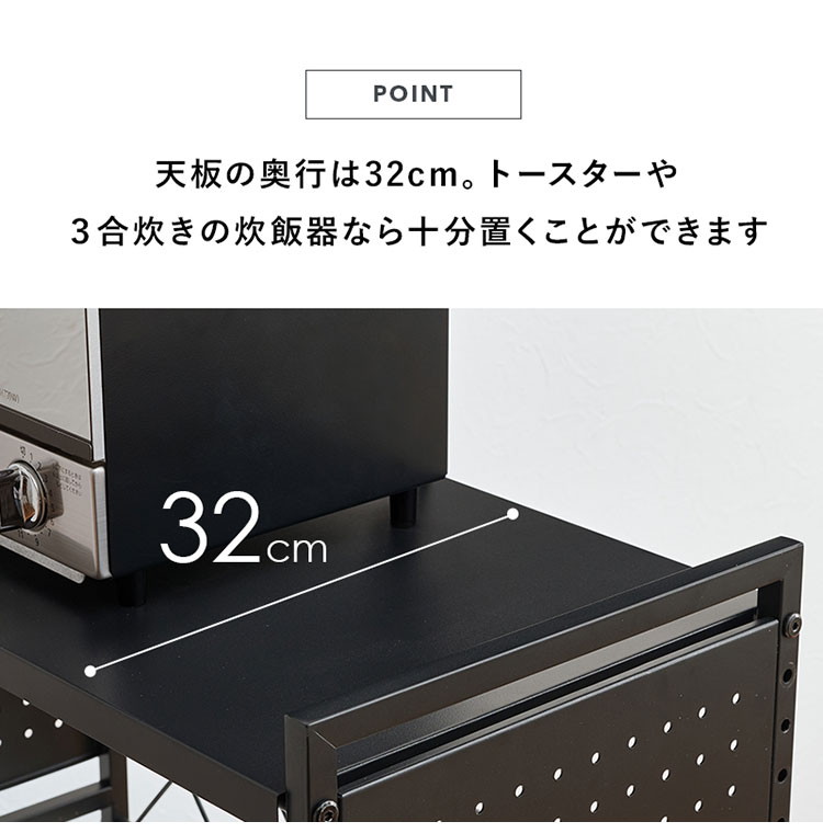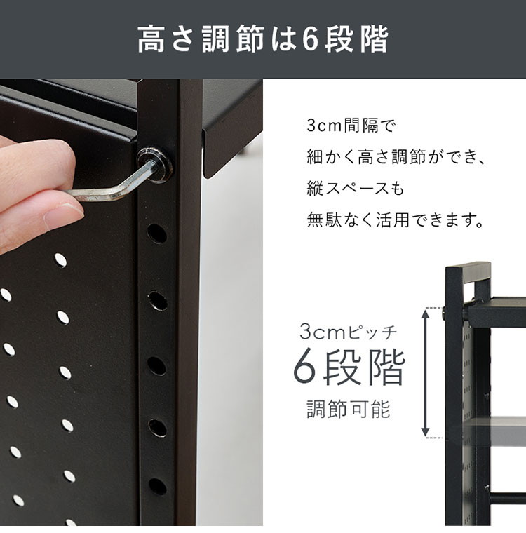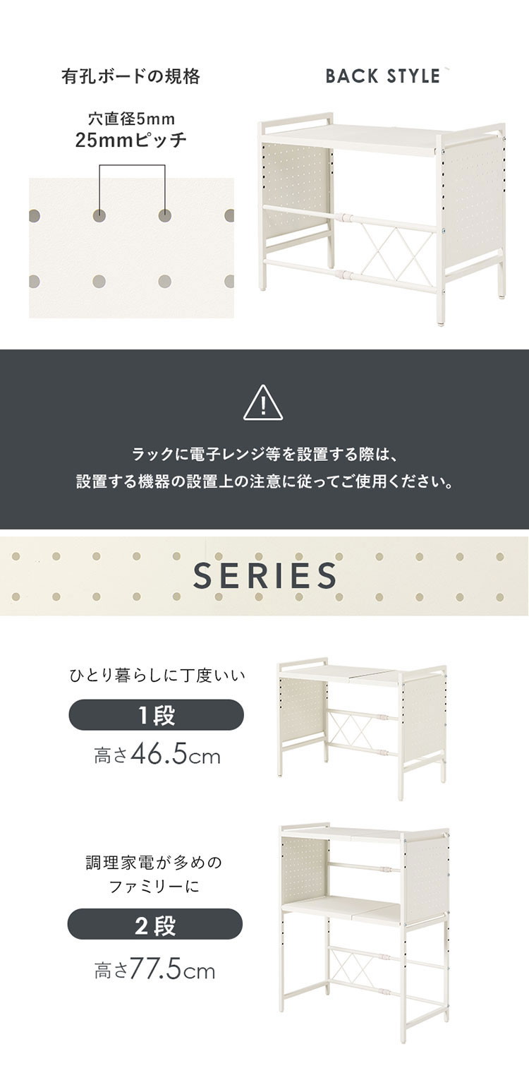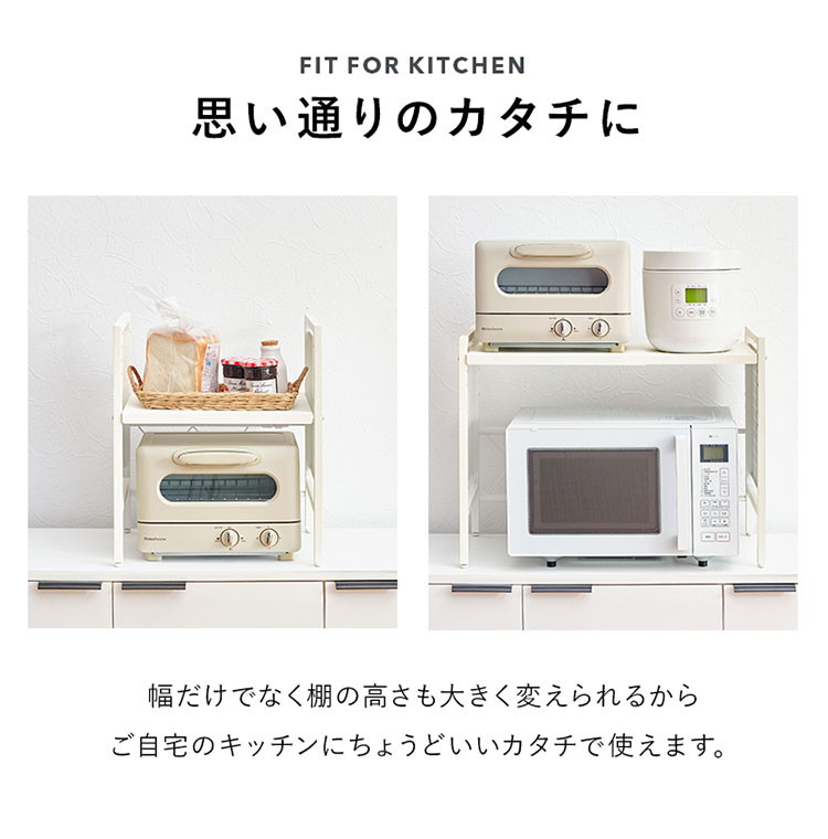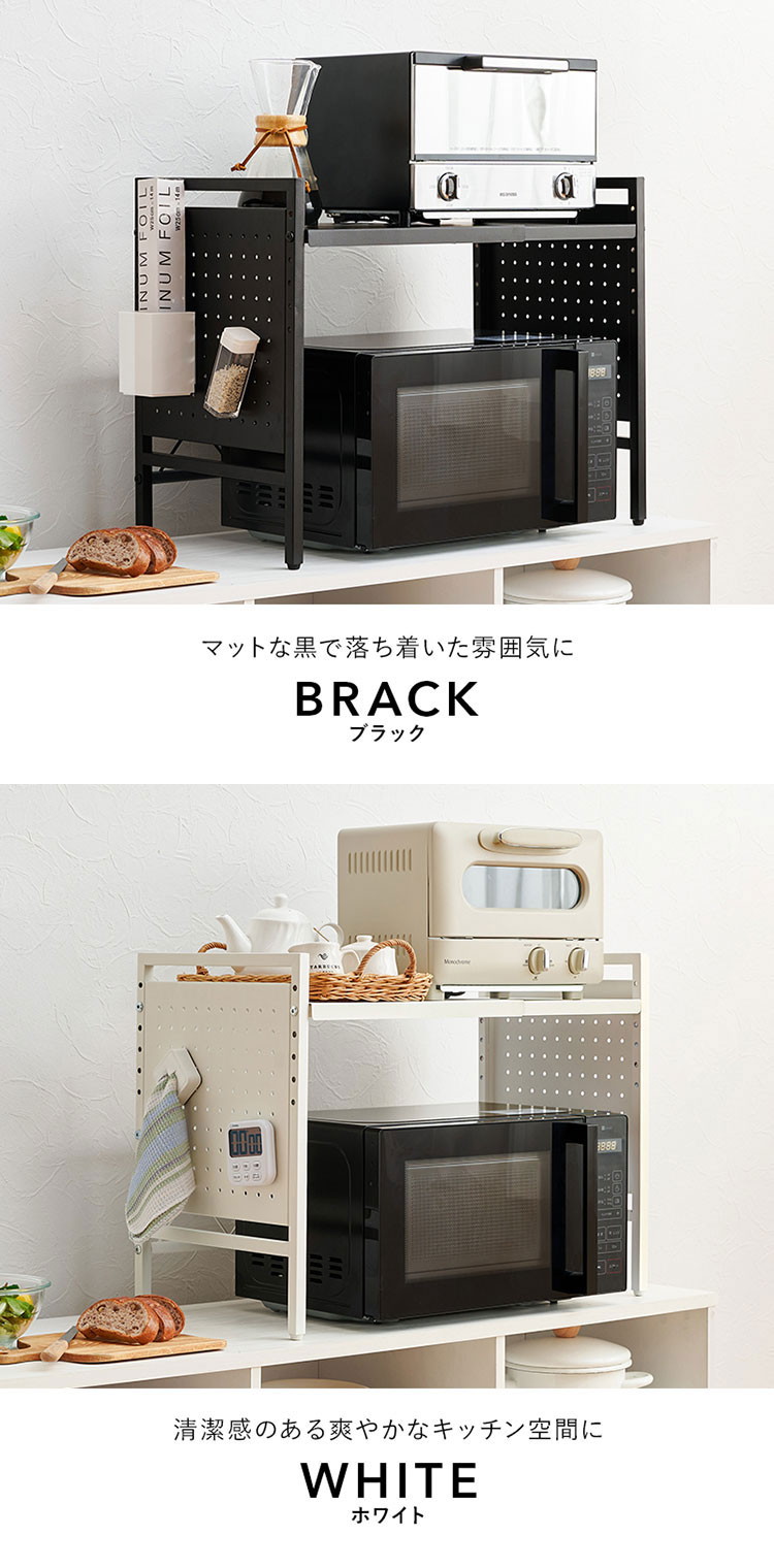 お手持ちの電子レンジや家電に合わせて幅や棚の高さを調節できる伸縮ラック。側面はスチール製の有効ボードなので磁石やフックが使えます。