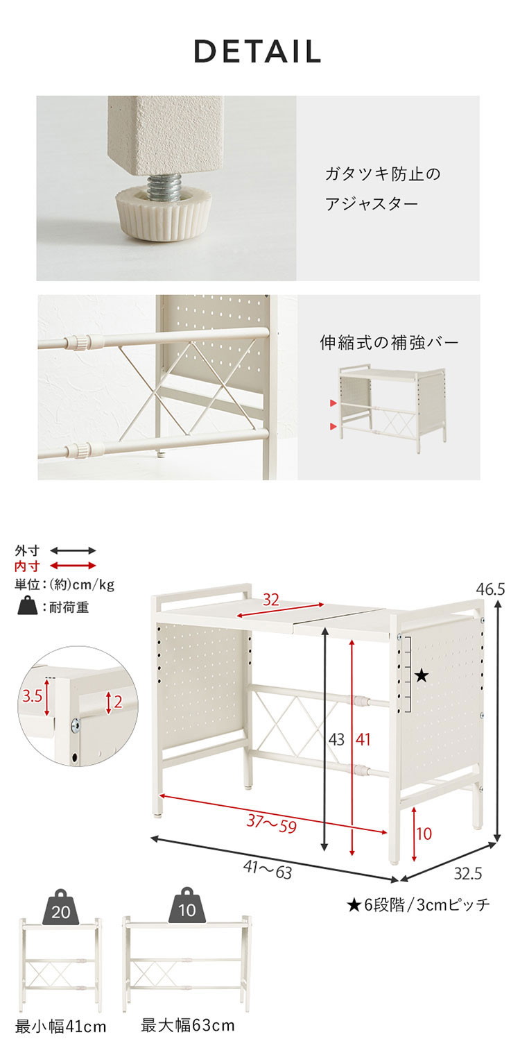 伸縮式 レンジ上ラック 幅41cm~63cm 奥行32.5cm 可動棚 伸縮 レンジラック トースターラック ブラック